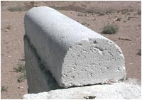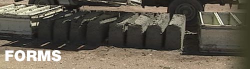 Mike McCain uses recycled metal grocery store shelving for forms. He has modified a 4-wheel drive vehicle to mix 1000 gallons (4500 liters) of slurry at a time. When the mix is ready, he moves the mixer next to the forms and lets the mix pour out as he drives slowly past the forms. When the mix is set, he uses a second vehicle, equipped with a homemade boom and electric winch to lift the metal forms off the blocks. While the forms are still in the air, he moves them down the line to place them at the next location for filling. Mike can repeat the entire process about once every thirty to forty-five minutes. His blocks are small logs 12 inches (30 centimeters) by 12 inches by three feet (about a meter) after trimming.